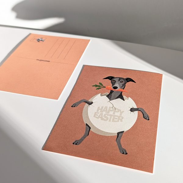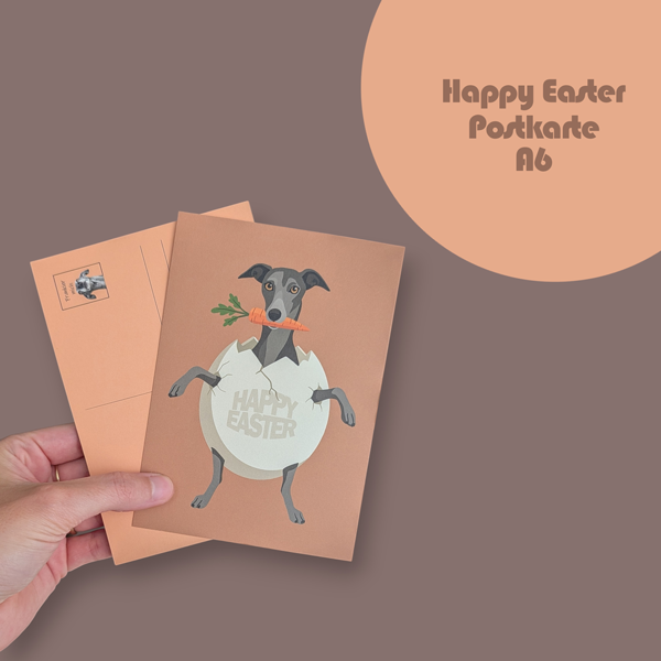Diese Osterpostkarte zeigt Euch ein freches Windspiel, welches kurzerhand die Eierschale sprengt und mit Karotte im Maul direkt ins Ostergeschehen schlüpft – der Osterhase hat wohl Konkurrenz bekommen.